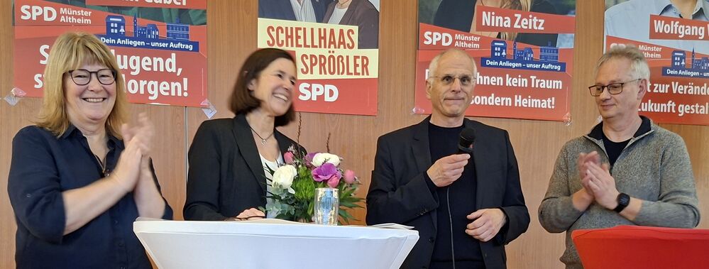 Erneut luden die SPD-Ortsvereine aus Eppertshausen, Münster und Dieburg zum gemeinsamen Neujahrsempfang in die Kulturhalle nach Münster ein. Auf dem Foto von links nach rechts: Sabine Schnurr, Voritzende SPD Dieburg, Christel Sprößler, Sozialdezernentin des Landkreises und SPD-Spitzenkandidatin auf der Kreistagsliste sowie SPD-Kandidatin für die Landratswahl 2027, Gerald Frank, Vorsitzender SPD Münster und SPD-Listenplatz 25 für den Kreistag, Andreas Karl, Vorsitzender SPD Eppertshausen und SPD-Listenplatz 29 für den Kreistag.