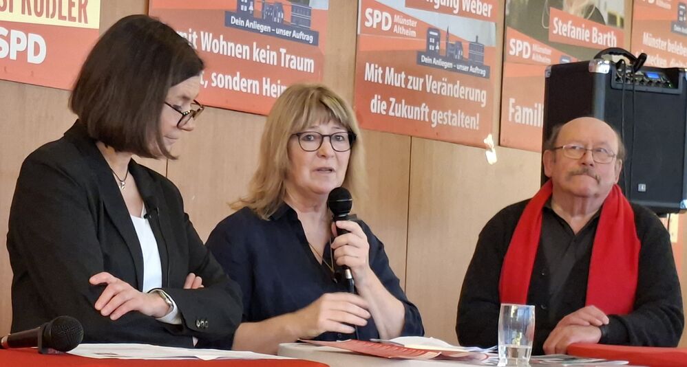 Christel Sprößler stellte weitere Kandidierende für die Kommunalwahlen aus Münster und Eppertshausen vor. Sie begann mit den Münsterer Gastgebern, für die Nina Zeitz (Listenpkatz 1) und Wolfgang Weber (Listenplatz 4) aufs Podium kamen und sich für die dortige Gemeindevertretung bewerben. Zeitz erklärte, dass die Schaffung bezahlbaren Wohnraums im Fokus der Münsterer SPD stehe. Der SPD-Kandidat Cornelius Hecker wurde für die Ortsbeiratswahl in Altheim vorgestellt.