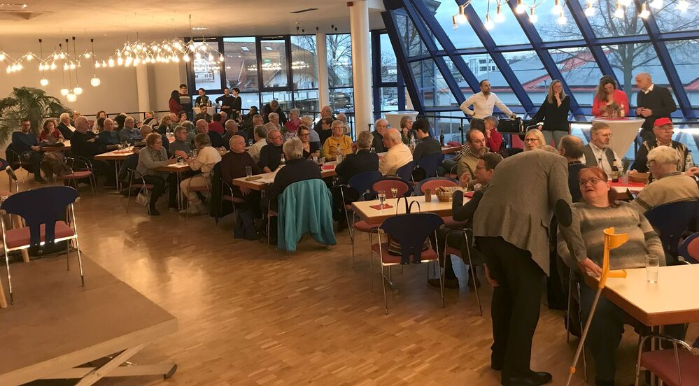 Unter den dichtgedrängten Gästen wurden Landrat Pit Schellhaas, Münsters parteiloser Bürgermeister Joachim Schlett und der Bürgermeister von Fischbachtal Philipp Thoma (SPD) sowie Vertreter der Münster FDP und ALMA herzlich begrüßt. Man respektiert und schätzt sich unter den unterschiedlichen Parteien – ein Zeichen guter demokratischer Kultur.Ne ben Parteimitgliedern sorgten auch viele viele Bürgerinnen und Bürger dafür, dass das Foyer der Kulturhalle gut gefüllt war.