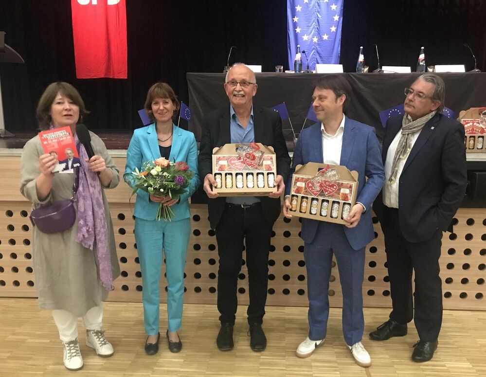 Teilnehmer: Sabine Schnurr (Vorsitzende des SPD-Ortsvereins Dieburg), Heike Hofmann (Hessische Ministerin für Arbeit, Integration, Jugend und Soziales), Udo Bullmann (SPD-Europaabgeordneter), Dr. Jens Zimmermann (SPD-Bundestagsabgeordneter) und Klaus Peter Schellhaas (Landrat des Landkreises Darmstadt-Dieburg).
